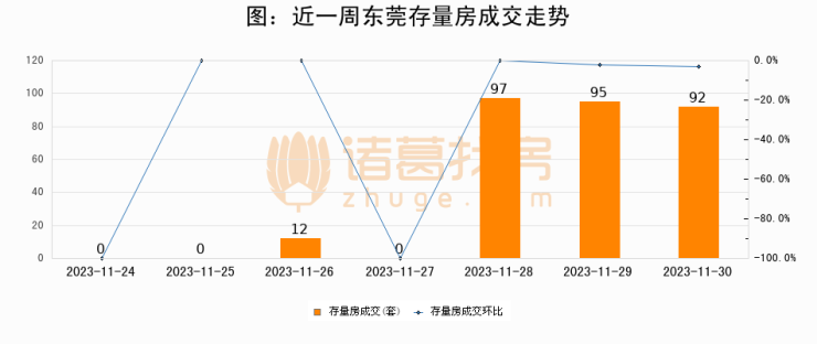 从存量房来看,2023年11月30日东莞存量房单日成交92套,比昨日减少3套,环比下降3.2%。从近一周存量房成交来看,东莞存量房日均成交套数为42套,11月30日单日成交92套,高于近一周平均水平119%。