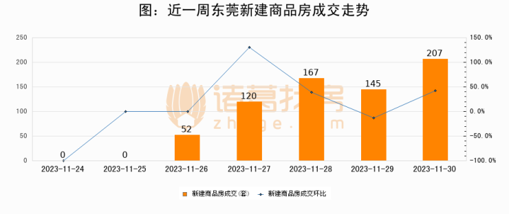 根据东莞市住房和城乡建设局数据显示,2023年11月30日东莞新建商品房成交207套,较昨日增加62套,环比上涨42.8%