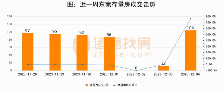 从存量房来看,2023年12月04日东莞存量房单日成交104套,比昨日增加92套,环比上涨766.7%。从近一周存量房成交来看,东莞存量房日均成交套数为69套,12月04日单日成交104套,高于近一周平均水平50.7%。