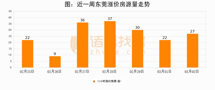根据诸葛找房数据显示,东莞24小时涨价房源量为27套,较03月01日增加5套,环比上涨22.7%。与此同时,涨价房源占比小幅扩大,业主信心有所提升。