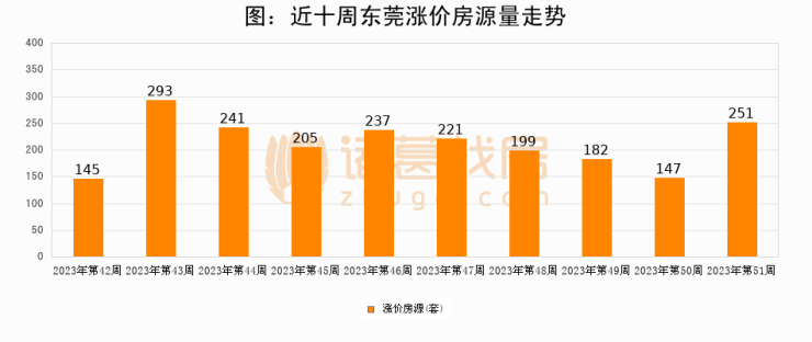从调价房源来看,第51周东莞涨价房源251套,较上周上涨70.7%。与此同时,51周涨价房源占比提升1.77个百分点,业主信心持续恢复。