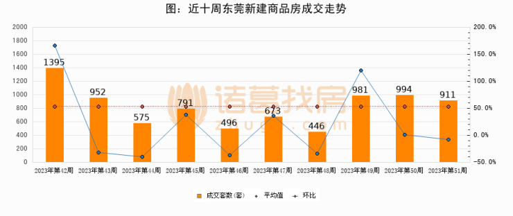 进入2023年第51周(12月11日-12月17日),东莞新建商品房成交911套,较上周减少83套,环比下降8.3%