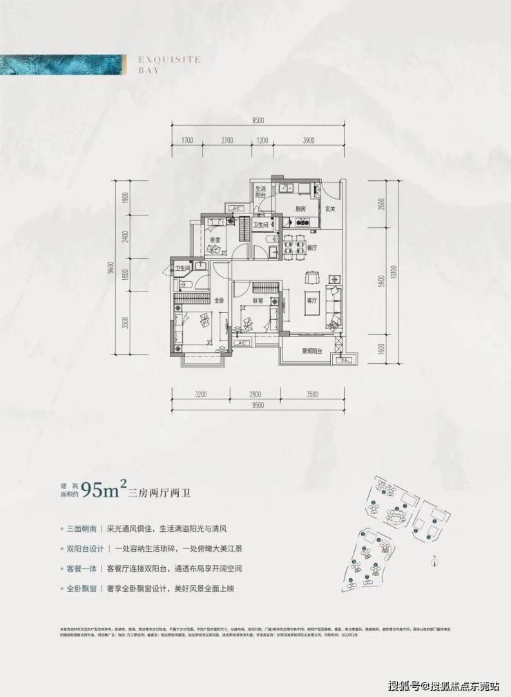 94㎡三房户型动静分区,三开间朝南,全卧飘窗设计,除了景观阳台外,还设置了生活阳台,生活观景两不误。