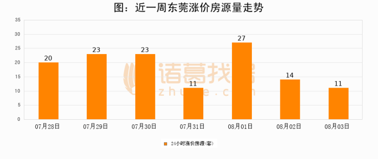 根据诸葛找房数据显示,东莞24小时涨价房源量为11套,较08月02日减少3套,环比下降21.4%。与此同时,涨价房源占比小幅回落,对于购房者来说是一个入市窗口期,购房者可抓住时机入市。
