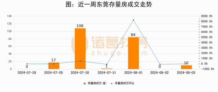 从存量房来看,2024年08月03日东莞存量房单日成交10套,比昨日增加10套,环比上涨0%。从近一周存量房成交来看,东莞存量房日均成交套数为31套,08月03日单日成交10套,低于近一周平均水平67.7%。