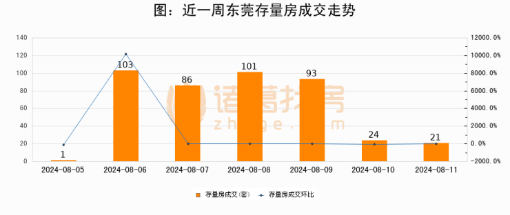 从存量房来看,2024年08月11日东莞存量房单日成交21套,比昨日减少3套,环比下降12.5%。从近一周存量房成交来看,东莞存量房日均成交套数为61套,08月11日单日成交21套,低于近一周平均水平65.6%。