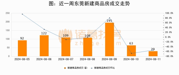 根据东莞市住房和城乡建设局数据显示,2024年08月11日东莞新建商品房成交29套,较昨日减少34套,环比下降54%。近一周东莞新建商品房日均成交103套。08月11日单日成交29套,低于近一周平均水平71.8%。