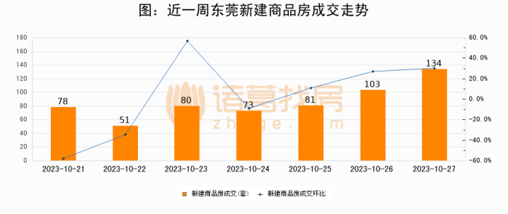 根据东莞市住房和城乡建设局数据显示,2023年10月27日东莞新建商品房成交134套,较昨日增加31套,环比上涨30.1%