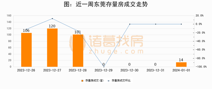 从存量房来看,2024年01月01日东莞存量房单日成交14套,比昨日增加14套,环比上涨0%。从近一周存量房成交来看,东莞存量房日均成交套数为48套,01月01日单日成交14套,低于近一周平均水平70.8%。