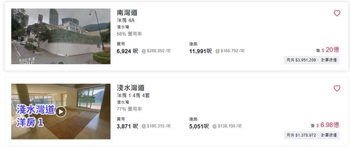 另一套位于浅水湾道的建筑面积为5051呎(约469.25平方米)的洋房,售价6.98亿港元(约人民币5.67亿元),折合单价120.83万元/平方米。