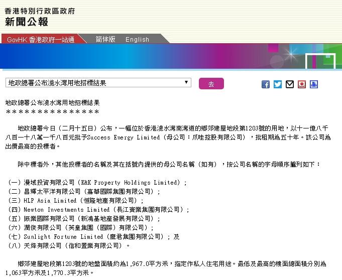 据香港地政总署信息,此次地块招标共有9家企业参与投标,分别为漫域投资、嘉华国际、恒隆地产、新鸿基、英皇集团、长江实业、鹰君集团、信和置业和爪哇控股。爪哇控股为出价较高的投标者。