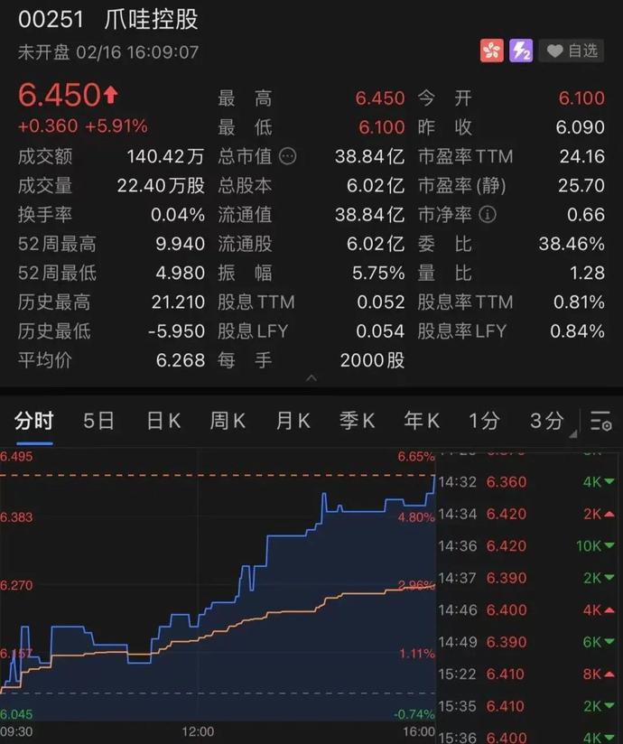 截至16日收盘,爪哇控股股价报6.45港元/股,涨幅为5.91%,较新市值38.84亿港元。