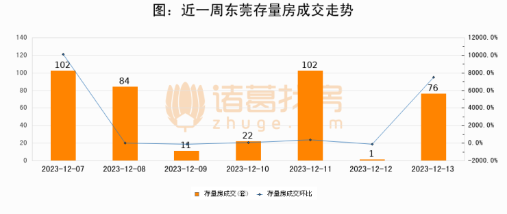 从存量房来看,2023年12月13日东莞存量房单日成交76套,比昨日增加75套,环比上涨7500%。从近一周存量房成交来看,东莞存量房日均成交套数为56套,12月13日单日成交76套,高于近一周平均水平35.7%。