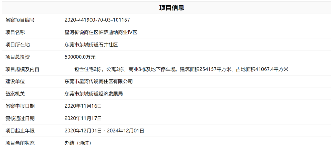 直到2020年11月,星河传说商住区帕萨迪纳商业IV区通过项目备案申报,计划投资50亿元。