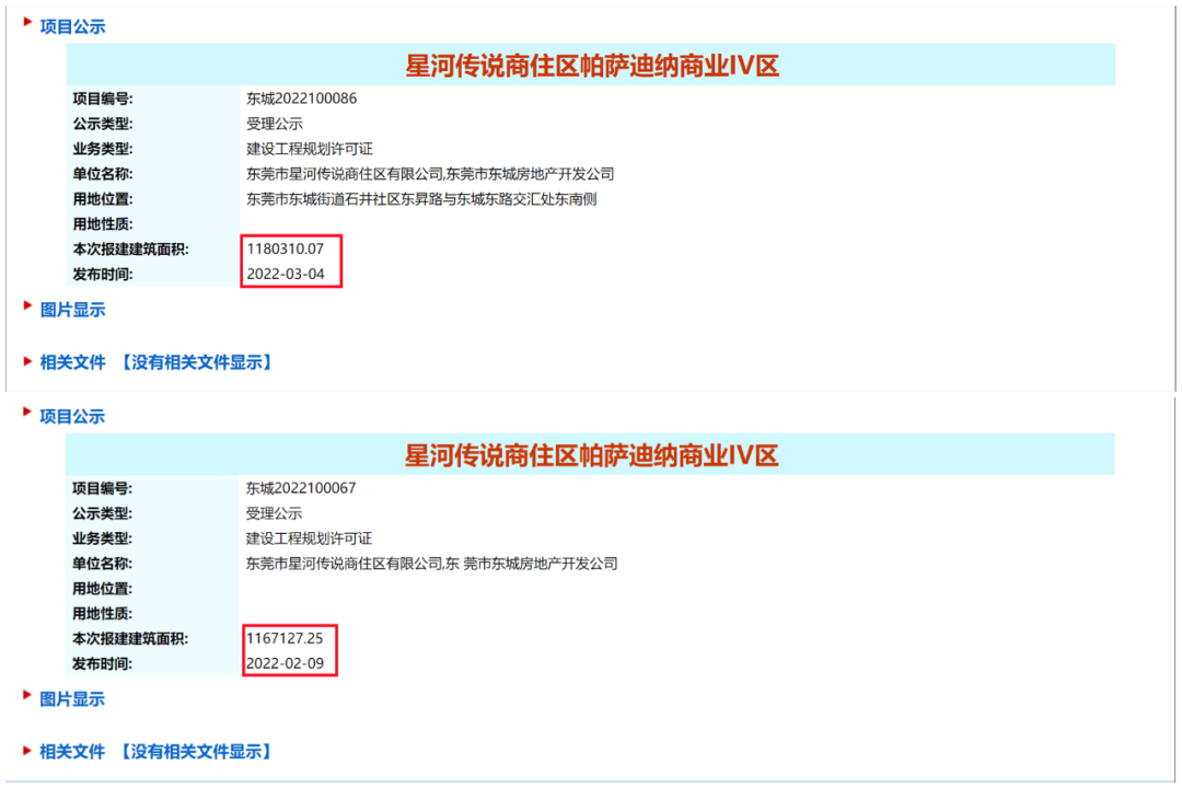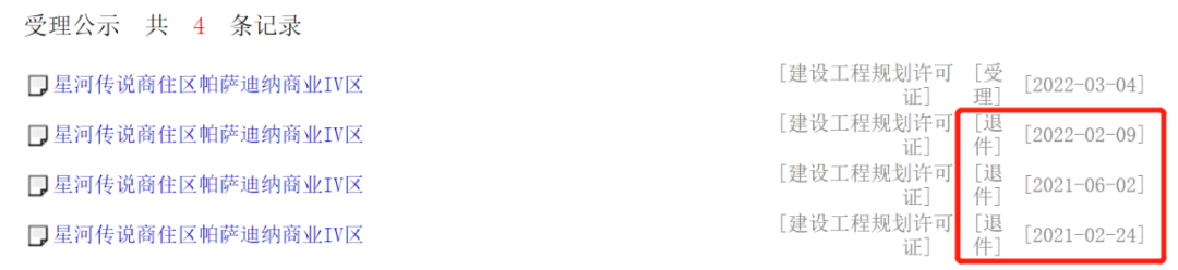 而从东莞市自然资源局处查询可知,星河传说商住区帕萨迪纳商业IV区在2021年到至今,曾多次申报《建设工程规划许可证》,但遭遇多次退件,一直到2022年3月4日才被受理。