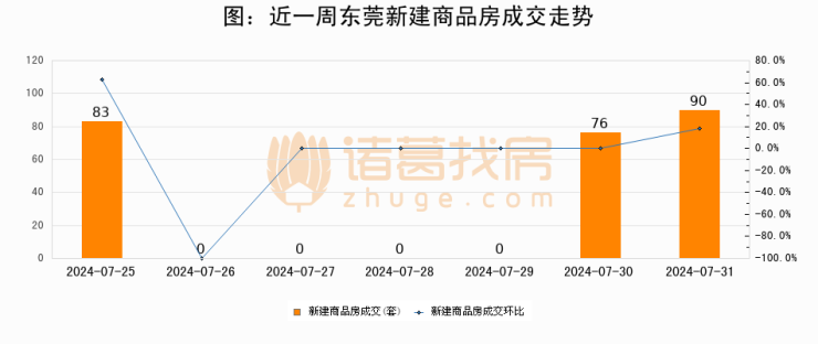 根据东莞市住房和城乡建设局数据显示,2024年07月31日东莞新建商品房成交90套,较昨日增加14套,环比上涨18.4%