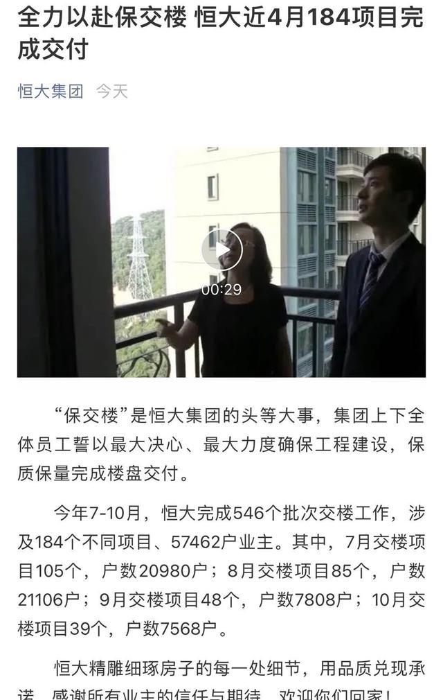 今年7-10月,恒大完成546个批次交楼工作,涉及184个不同项目、57462户业主。其中,7月交楼项目105个,户数20980户;8月交楼项目85个,户数21106户;9月交楼项目48个,户数7808户;10月交楼项目39个,户数7568户。