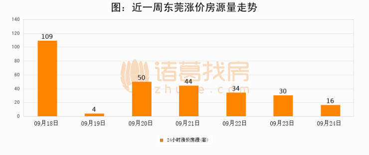 根据诸葛找房数据显示,东莞24小时涨价房源量为16套,较09月23日减少14套,环比下降46.7%。与此同时,涨价房源占比小幅回落,对于购房者来说是一个入市窗口期,购房者可抓住时机入市。