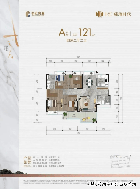 建面约121㎡四房也是项目热卖的明星户型,两梯五户,南北对流,四开间朝南设计,让三代同堂的改善梦想,一步到位。南向景观阳台连通客厅及次卧,提升了空间的通透性和明亮度,能容纳更多阳光清风。