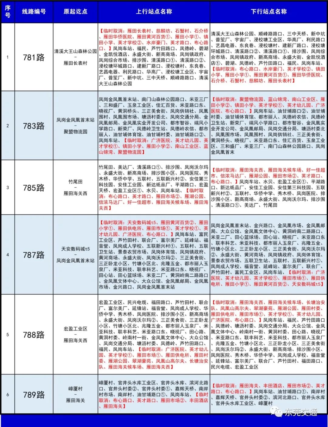 公交调整 即日起, 临时调整781路、783路、785路、787路、788路、789路等6条公交线路起讫站点,部分停靠站点临时取消 ,具体线路信息详见以下表。