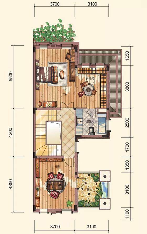 三层为主人房设计,主卧配备豪华衣帽间,更显大气也独具空间感。更重要的是,还有带超大露台的豪华书房,阅读、观景一步到位。