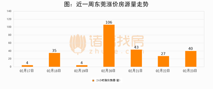 根据诸葛找房数据显示,东莞24小时涨价房源量为40套,较02月22日增加13套,环比上涨48.1%。与此同时,涨价房源占比小幅扩大,业主信心有所提升。