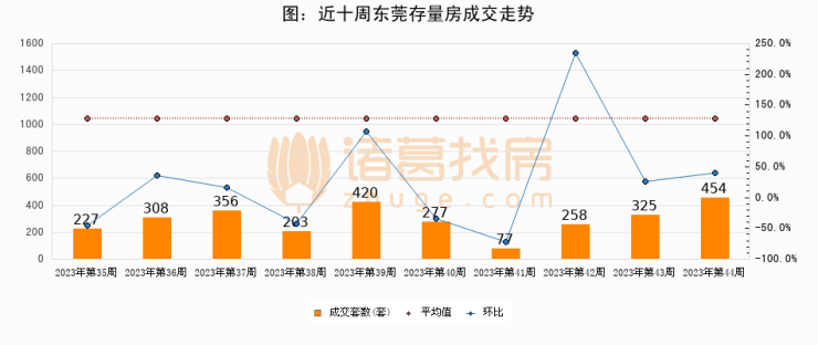 存量房方面,第44周东莞存量房成交454套,较上周增加129套,环比上涨39.7%。从近十周成交走势来看,周均成交套数为290套,本周高于平均水平56.6%。