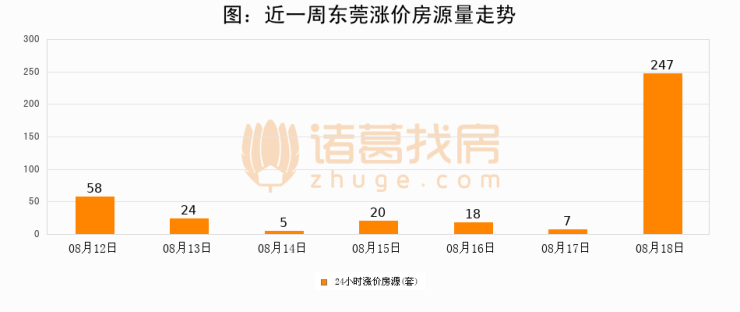 根据诸葛找房数据显示,东莞24小时涨价房源量为247套,较08月17日增加240套,环比上涨3428.6%。与此同时,涨价房源占比小幅扩大,业主信心有所提升。